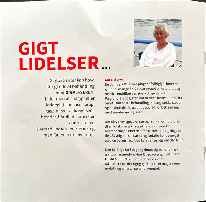 "Jeg fik 10 behandlinger i "Gigamaskinen" og behandlingerne havde effekt med det samme. Efter første behandling kom der ro i mit knæ og hævelsen foretog sig. Ved hver anden behandling fik jeg ondt, på den gode måde kunne jeg mærke, at der var noget der arbejdede inde i knæet, dog tog det kun ca. 1 døgn og smerterne var væk igen. jeg har et knæ, der mangler det meste af menisken og derfor ikke kan blive som nyt. Det vil derfor give god mening, at vedligeholde behandlingerne."